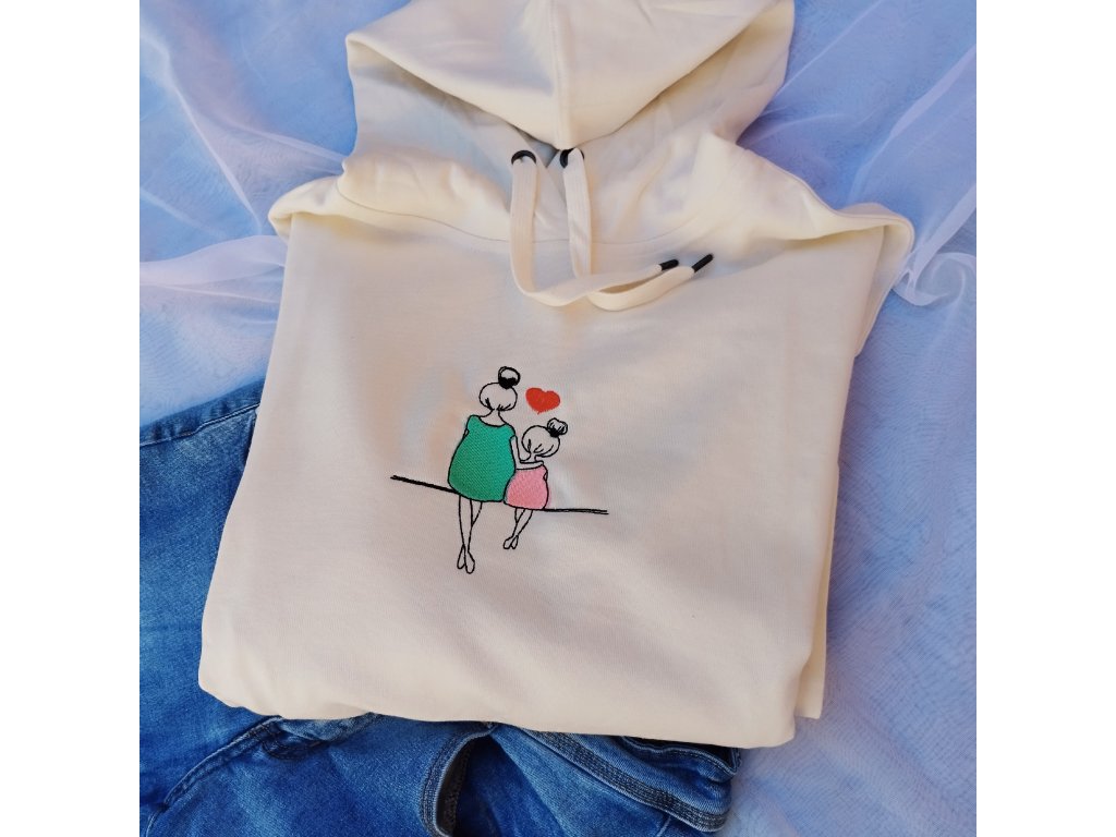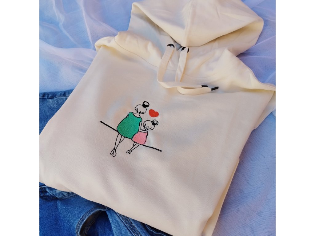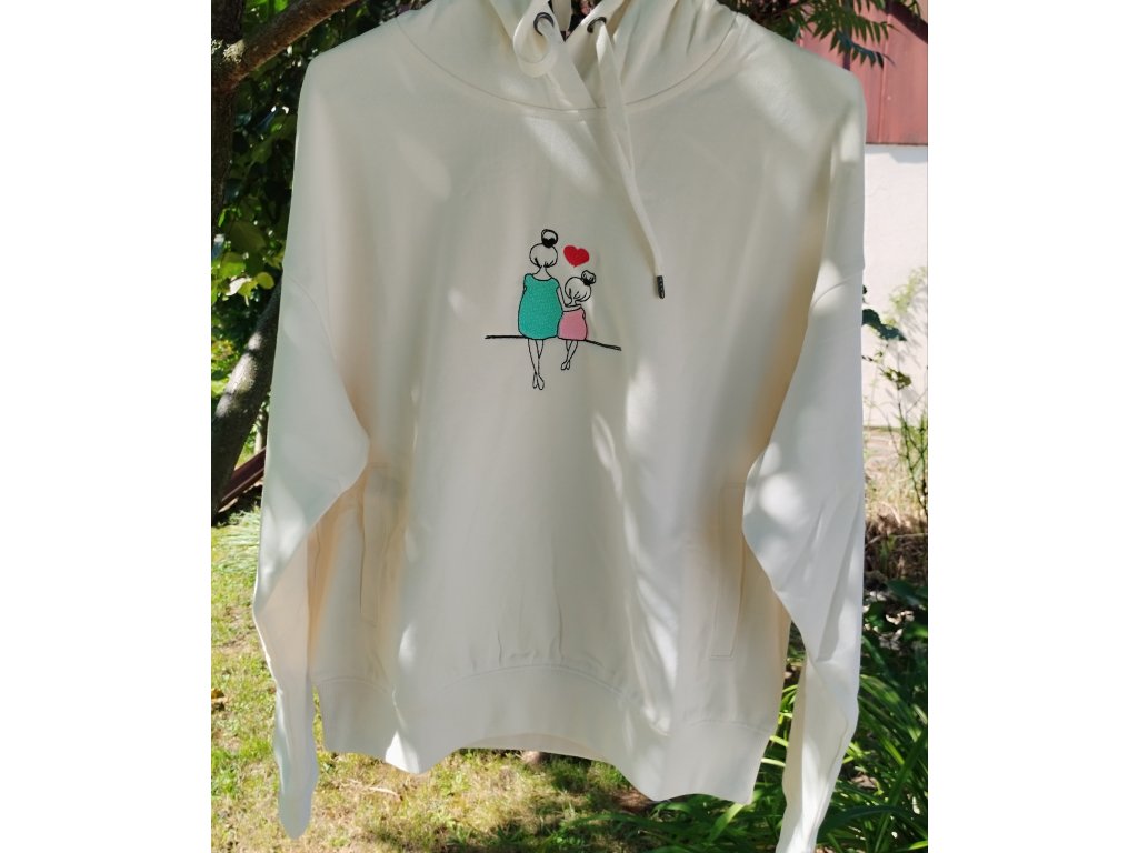 Mikina v oversize štýle s výšivkou maminky a dcéry. Zateplená s dvomi prednými vreckami.